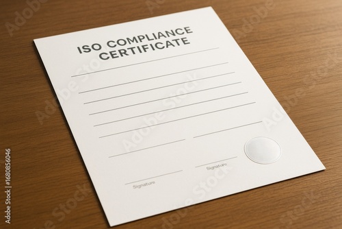 ISO compliance certificate blank form on wooden desk with soft light and industry-related concept emphasizing quality and regulatory background. Ai generative
