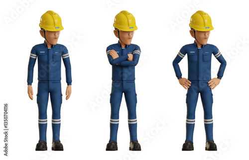 men at work, industrial, industry, operator, construction, maintenance, heavy duty, engineering, mechanical, side, labor, engineer, look, floor, under, below, consider, front, technician, foreman, man, person, people, blue, uniform, shirt, yellow, helmet, work, safety, goggles, stipe, clothing, three-dimensional, render, isolate, isolated, cartoon, illustration, character, transparent, white, background, civil, site, view, portrait