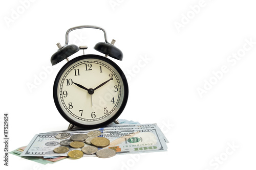 clock, money, dollar, cash, coin, time, concept, finance, financial, management, business, isolated, white, background, vintage, antique, currency, wealth, profit, deadline, earn, market, bank, savings, exchange, hours, minute, ten, 2, front view, alarm, watch, deal, payment, retirement, 100, wages, salary, commercial, investment, buy, circle
