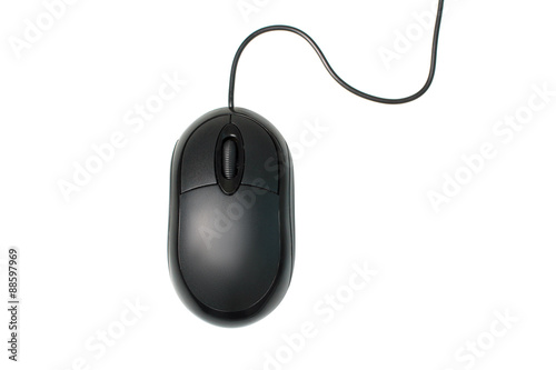 closeup, isolated, nobody, white, horizontally, mouse, cyberspace, mechanical, contraption, 1, black, computer, equipment, object, shiny, control, plastic, work, wire, device, buttons, electronic, white background, wheel, topview