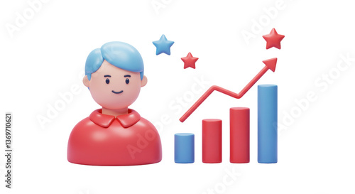 cartoon, man, graph, star, business, success, growth, achievement, isolated, illustration, three-dimensional, render, chart, progress, finance, marketing, strategy, planning, improvement, statistic, performance, target, goal, leader, employee, person, male, character, icon, symbol, graphic, design, red, blue, positive, optimistic