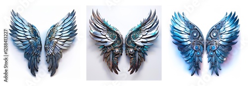Isolated collection of three pairs of ornate wings. Metallic and feathery texture in blue, silver, and brown hues against a white backdrop.