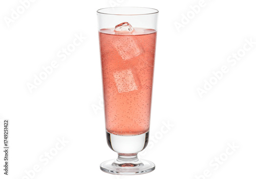 Isolated drink with ice in clear glass, pink beverage with bubbles and condensation visible