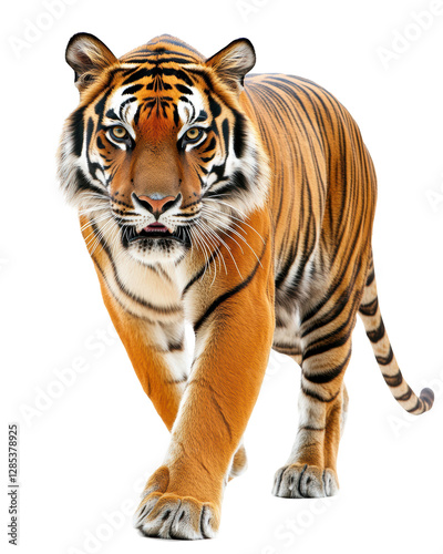 tiger, bengal tiger, animal, wildlife, cat, predator, carnivore, mammal, walking, isolated, orange, black, stripes, fur, portrait, powerful, strong, dangerous, big cat, zoo, wild, hunter, nature, jungle, forest, graceful, beautiful, fierce, closeup, eye contact, paw, tail, wild animal, wildcat