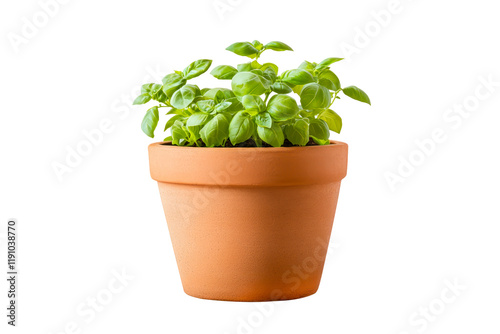Isolated fresh basil with green leaves growing in rustic terracotta pot against transparent background. Perfect for sustainable gardening, culinary projects, sustainable food or kitchen decor ideas