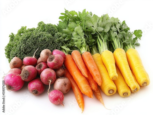 Isolated fresh vegetables featuring crunchy carrots, radishes, and colorful roots on a bright clean white background