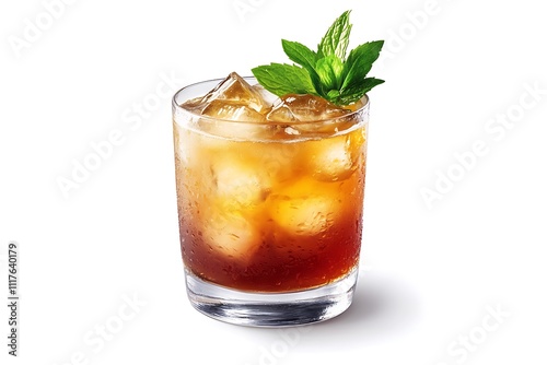 Isolated glass of iced tea with fresh mint and ice cubes on a white background
