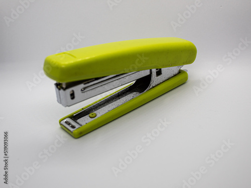 isolated green stapler with selected focus on white background
