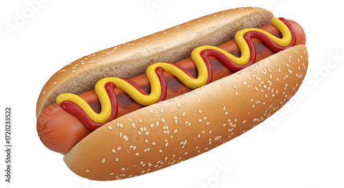 Isolated hot dog sandwich with ketchup and mustard, fast food meal in a sesame bun, 3d illustration