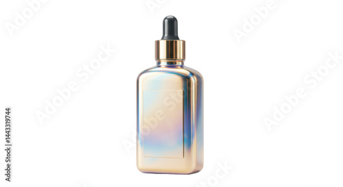 bottle, glasses, dropper, iridescent, shiny, cosmetic, essential oil, serum, isolated, beauty, skincare, health, wellness, product, container, liquid, medicine, pharmacy, design, illustration, graphic, three-dimensional, render, modern, elegant, luxury, reflective, transparent, chemistry, laboratory, science, research