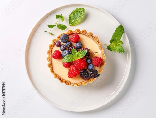 Isolated overhead view of a creamy cheesecake with golden crust, garnished with blueberries, strawberries, and mint