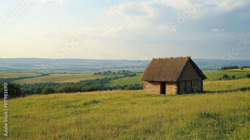 Isolated straw house standing on a grassy hilltop with expansive views of open fields in the background