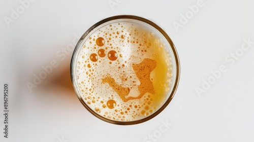 Isolated top-down shot of unfiltered lager beer in a glass, with golden hue, foam, and bubbles. Highlighting ale froth on a white background