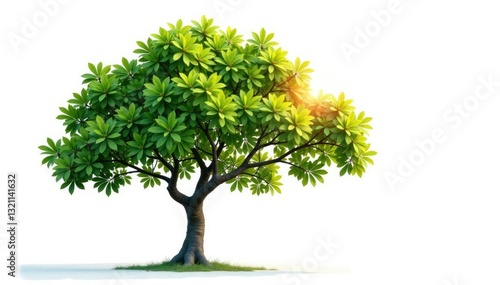 Isolated tree against a white background, with sunlight filtering through leaves, isolated scene, foliage