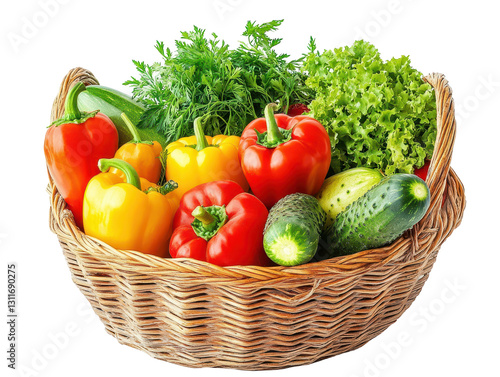 vegetable, basket, lettuce, cucumber, pepper, tomatoes, isolated, fresh, organic, healthy, food, still life, studio shot, closeup, macro, colourful, delicious, ripe, harvest, garden, farm, market, ingredient, vitamin, vegetarian, vegan, diet, nourishment, wood, wicker, woven, produce, plant, salad, green
