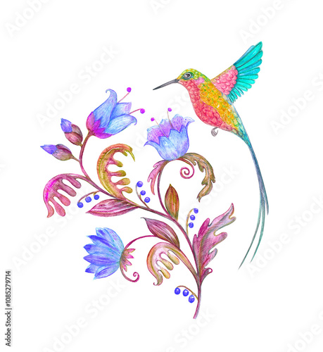isolated watercolor abstract floral ornament with long-tailed hummingbird purple and blue