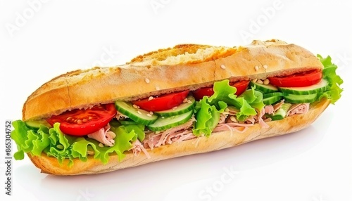 sandwich, tuna, baguette, isolated, bread, salad, white, background, food, eatery, menu, tomatoes, dinner, meal, lunch, sauce, cucumber, submarine