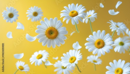 Isolated white daisy or chamomile blossom descending in the air against a background, illustrating a health, medical, or cosmetic levitation theme.