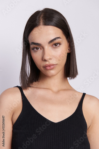 background, black hair, clear, clothing, confidence, confident, cool, expression, face, facial, female, femininity, fresh, front, haircut, isolated, looking, model, natural, honed, portrait, pose, profile, pure, skin, studio, white, youth