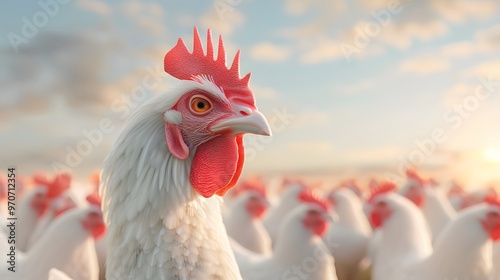 Isolated white rooster standing in a rural farm, a domestic fowl with red beak and feathers