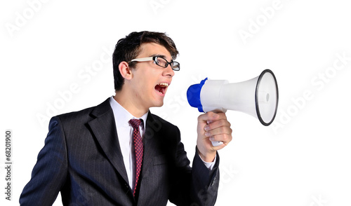 adult, ambitious, anger, announcement, authority, background, bullhorn, business, communicate, concept, emotion, energetic, eyeglass, holding, idea, isolated, loud, loudspeaker, male, man, megaphone, message, motivation, news, noise, office, person, portrait, power, public, scream, sound, speaking, speech, staff, student, success, talking, voice, warning, white, work, yelling, empty, space, copy, occupation, gesture, people, young