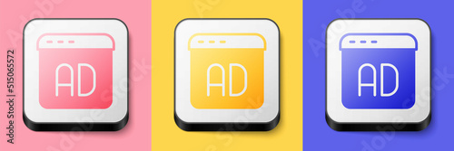 Isometric Advertising icon isolated on pink, yellow and blue background. Concept of marketing and promotion process. Responsive ads. Social media advertising. Square button. Vector