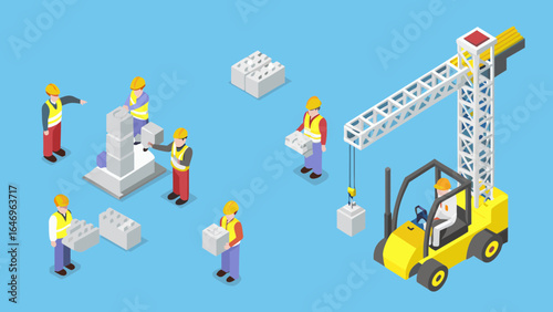 construction, isometric, men at work, crane, building, block, site, hard hat, vest, machinery, engineer, architect, development, industry, labor, teamwork, project, structure, concrete, lifting, transport, vehicle, yellow, blue, design, illustration, cartoon, safety, equipment, work
