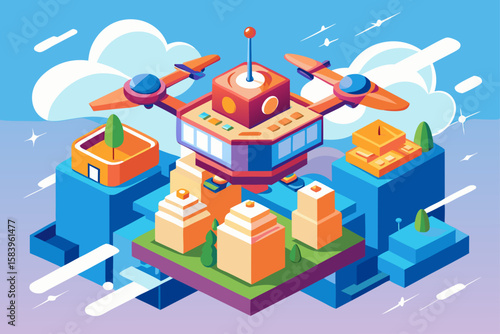 Isometric Food Delivery Drone Flying Over a City