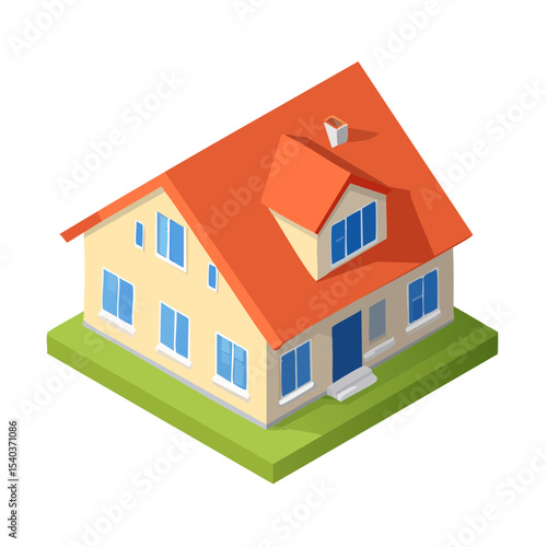 Isometric House Illustration, Two-Story Home with Orange Roof and Green Yard, Graphic Property