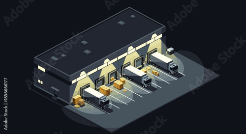 warehouse, isometric, building, delivery, cargo, distribution, logistic, transportation, shipment, architecture, industrial, box, parking, loading, dock, storage, vehicle, commerce, business, export, import, global, trade, nocturnal, night, illumination, dark, container, unloading, package, exterior, destination, supply, freight, wholesale, enterprise, commercial, structure, roadway, evening