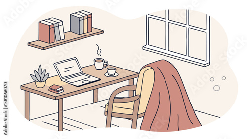 desk, laptop, plant, coffee cup, stationery, workspace, isometric, window, notebook, pen, cup, paper, leaf, pot, mug, computer, office, work, study, room, interior, furniture, drawing, illustration, design, art, table, indoor, home, cosy, minimalist, modern, vignetting, still life, creative, artistic, digital artwork, graphic, desktop, writing, reading, learning, brown
