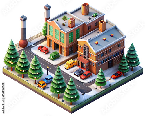 winter, city landscape, factory, building, car, isometric, snow, pine tree, urban, industrial, architecture, three-dimensional, illustration, city, street, town, miniature, model, design, christmas, holiday, season, festive, cosy, neighbourhood, community, environment, landscape, transportation, parking, diorama