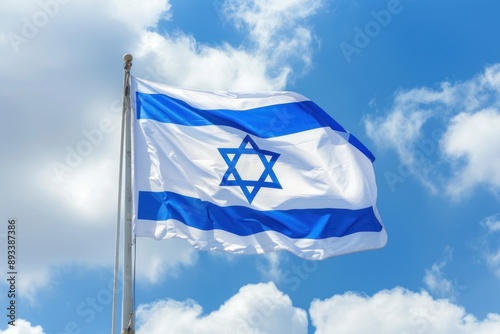 Israeli flag with a star of David cloudy sky background
