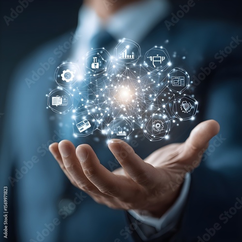 IT Consulting. Businessman holds digital consulting network connecting icon representing IT solutions, focusing on innovation, strategy, optimization, growth, and technology-driven success