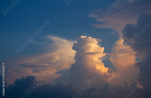 blue, cloud, cloudscape, thundercloud, cumulus, evening, high, landscape, natural, nature, orange, sky, sunset