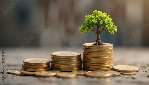 It is a stack of coins with a young tree as the background changes with the seasons.