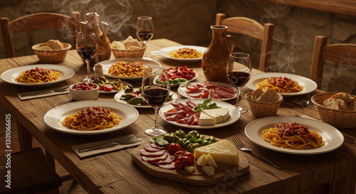 Italian Family Feast: Rustic Table Setting with Pasta & Wine
