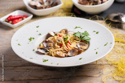 Italian food. Spaghetti with clams Juicy, garlic. Close up