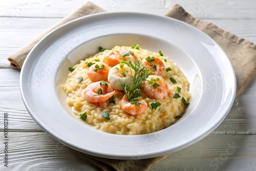 Italian lunch of shrimp creamy risotto with cheese on white dish