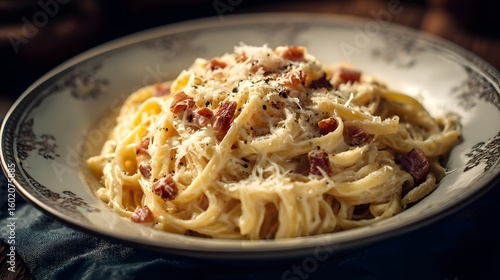 Italian pasta carbonara, creamy sauce and parmesan cheese