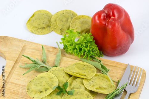 italian pasta ravioli with green herb on wood white background.