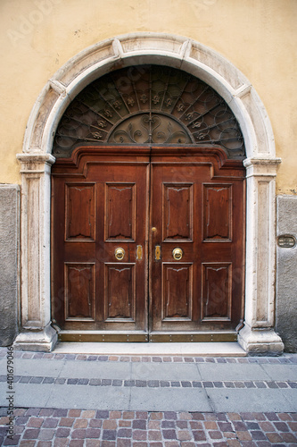 Italian retro wood style front door, element of the classic facade
