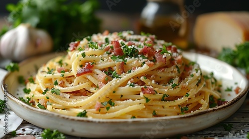 italian, spaghetti, carbonara, creamy, sauce, crispy, sprinkle, parmesan, cheese, served, white, plate, ai, premium, concept, art, element, design, photo, image, illustration, background, wallpaper, graphic, resource