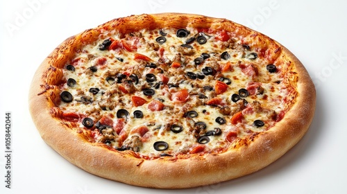 Italian-style pizza with stretchy cheese, vibrant toppings, and a rustic look on a plain white background, inviting and appetizing