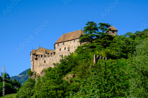 Italy, South Tyrol, Sarntal, Green trees against Runkelstein Castle