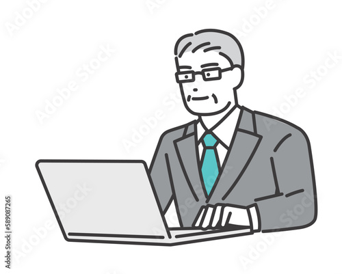 パソコンを操作する悩むシニアの経営者のベクターイラスト素材/ビジネスパーソン/IT/スーツ/DX