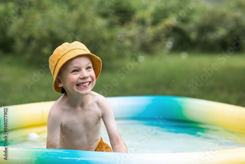 It's a hot day. A cute boy is swimming and splashing in the pool. A happy little boy smiles at the camera. Splashes of water are flying in all directions. The concept of summer holidays with children.