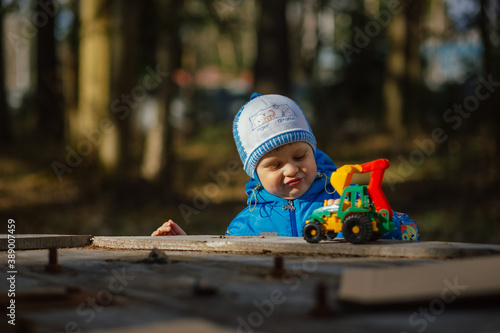 ittle caucasian boy playing with toy tracktor on wooden handmade table outside. Image with selective focus.