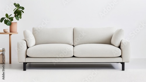 sofa, ivory, couch, furniture, interior, design, modern, minimalistic, leg, black, white, room, sitting, cushion, comfortable, home, decor, style, textile, fabric, apartment, residential, indoor, contemporary, seat, relaxation, soft, pillow, living, space, elegant, potted, plant, table, side, vase, ceramic, book, stack, decoration, background, simple, minimalist, clean, neutral, light, bright, studio