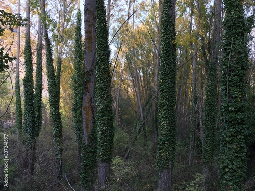 ivy covered tree trunks in forest